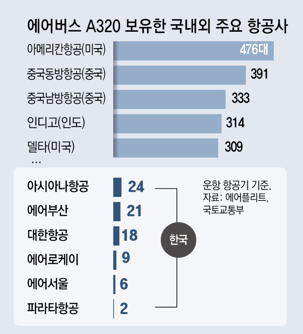 다만 이 중 리콜 대상 여객기 42대는 모두 소프트웨어 업데이트를 통해 1시간 안에 필요한 조치를 마쳐 결항 등 운항 차질은 발생하지 않았다. 국토교통부 관계자는 “30일 0시 기준으로 국내 항공사의 A320 항공기 42대의 소프트웨어 업데이트를 모두 마쳤다”고 설명했다. 국토부에 따르면 국내 항공사가 운영하는 A320 항공기는 중국, 일본, 동남아 등 중단거리 노선 대부분에 취항하고 있다.