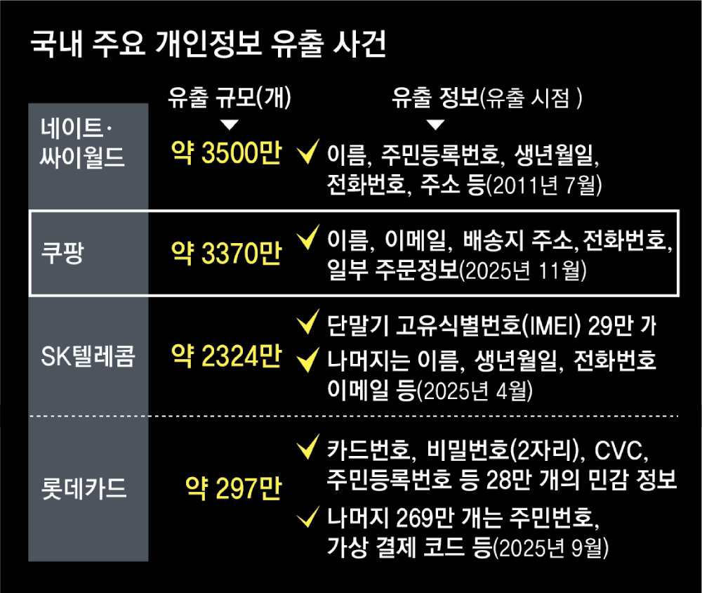 쿠팡의 대규모 개인정보 유출 사태로 성인 4명 중 3명의 개인정보가 털렸다. 이번 사건은 쿠팡이 일상생활과 가장 밀접한 초대형 플랫폼이었다는 점에서 역대 개인정보 유출 사건과 다른 ‘생활 침투형’ 유출이라는 분석이 나온다. 그만큼 체감 피해가 크고 2차 피해가 더 심각할 수 있다는 얘기다.