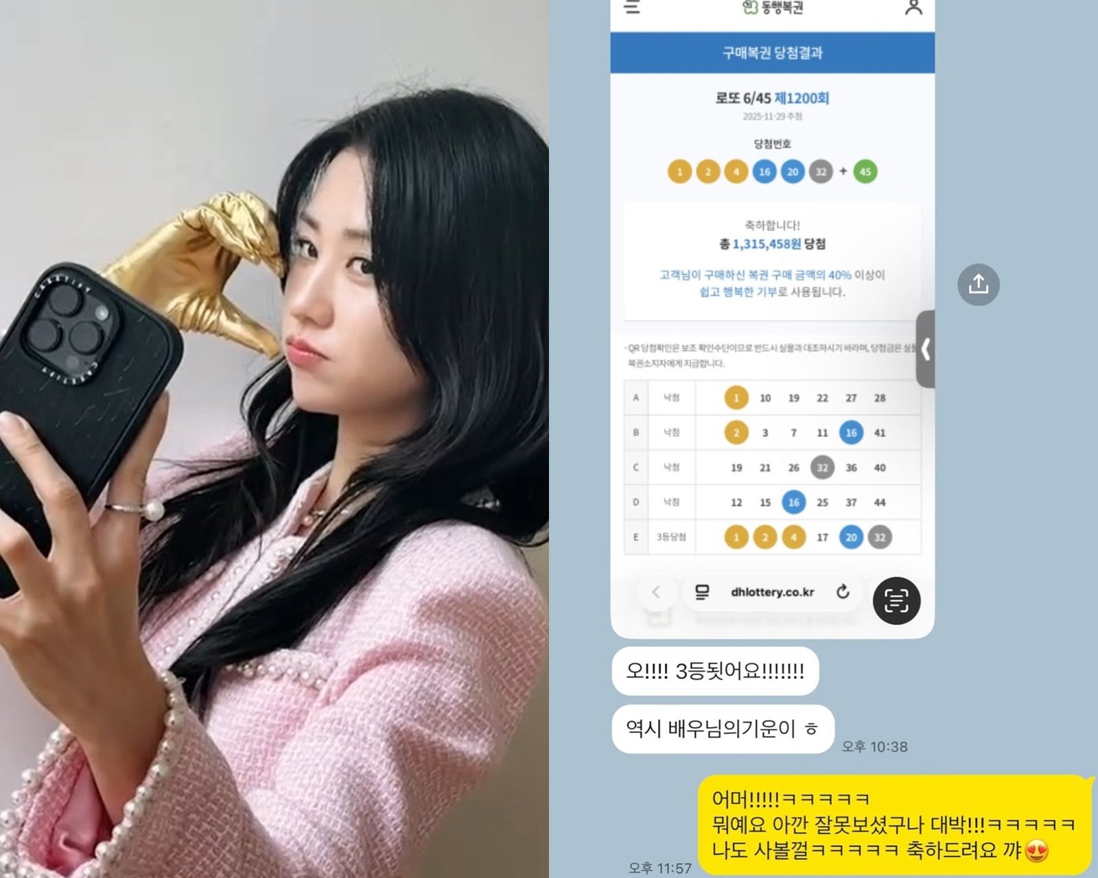 공개된 사진 속 박하선은 핑크색 투피스를 입고 황금 장갑을 낀 채 포즈를 취하고 있다. 이와 함께 매니저와 나눈 메시지를 공개해 눈길을 끌었다. 매니저는 “3등 됐어요. 역시 배우님의 기운이“라고 기뻐했고, 박하선 또한 ”나도 사볼걸. 축하드려요“라고 화답했다.