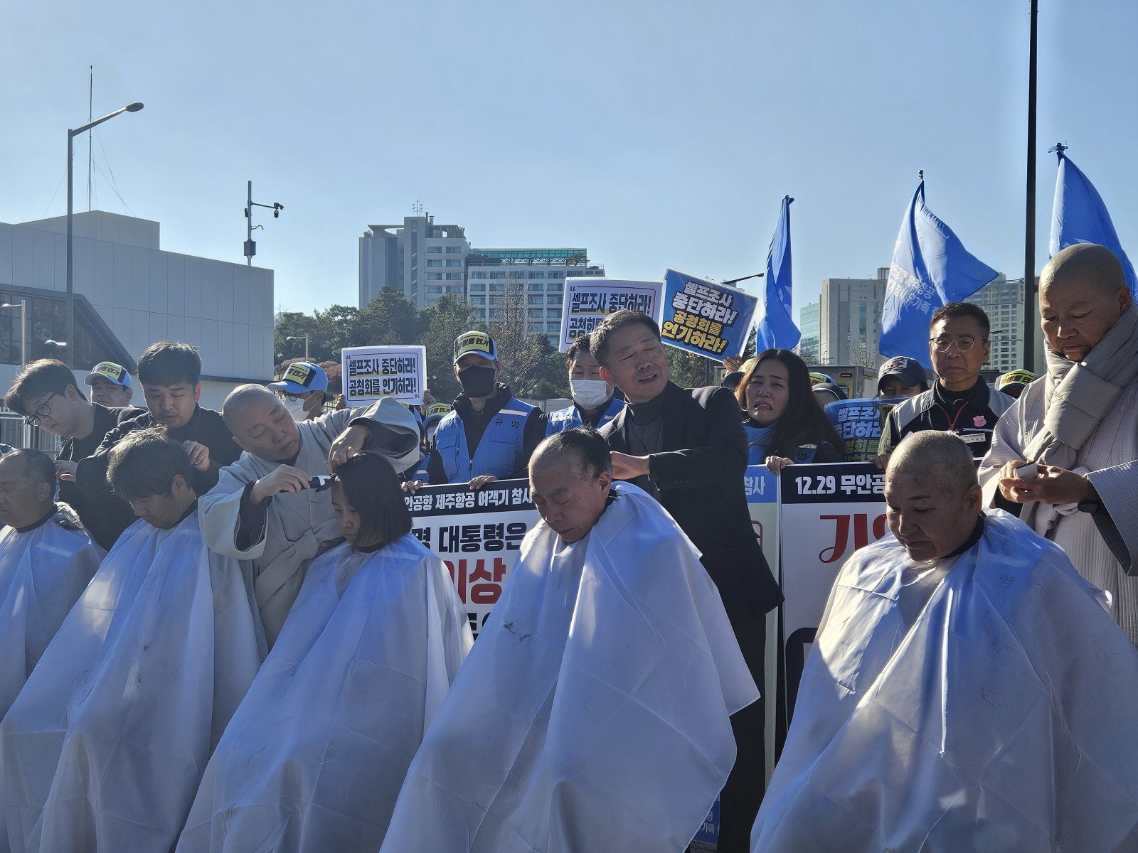 25일 서울 용산구 대통령실 인근에서 12·29 제주항공 여객기 참사 유가족들이 삭발식을 거행하고 있다. 2025.12.1 뉴스1
