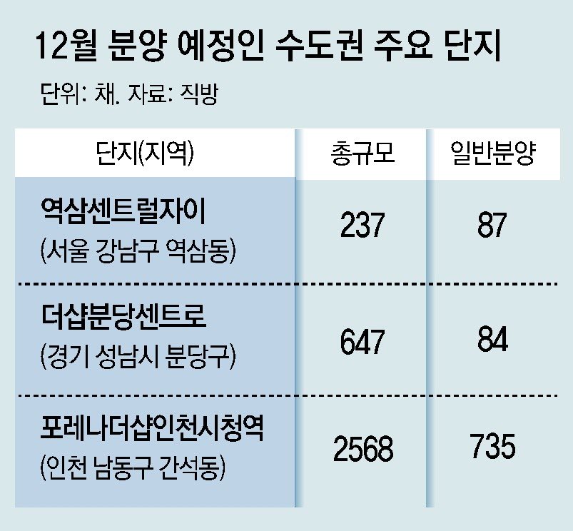 이달 전국에서 아파트 2만여 채가 분양된다. 선거 등으로 올해 초부터 분양을 미룬 단지가 많은 상황에서 대출 규제까지 이어지며 비수기인 연말에 오히려 ‘밀어내기 분양’이 늘어난 것이다. 아예 내년으로 분양 일정을 연기하는 단지도 나오고 있다.
