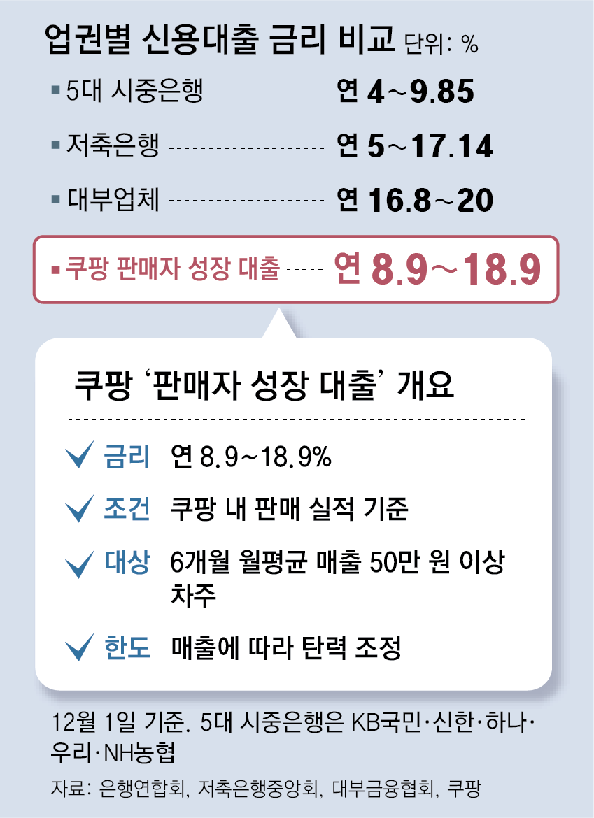 쿠팡이 입점 업체에 사업자금을 빌려주며 평균 14%, 최고 18.9% 금리를 책정한 것으로 나타났다. 은행권 이용이 어려운 입점 업체를 대상으로 한 상품이라지만 제2금융권 신용대출 금리와 비교해도 높은 수치라는 평가가 나온다.