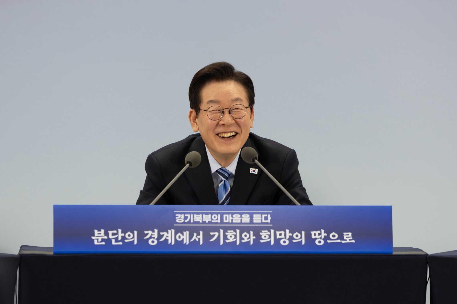 이재명 대통령이 14일 경기 파주시 라이브러리스테이 지지향에서 열린 ‘경기 북부의 마음을 듣다’ 타운홀 미팅에서 미소 짓고 있다. 2025.11.14. 대통령실 제공.