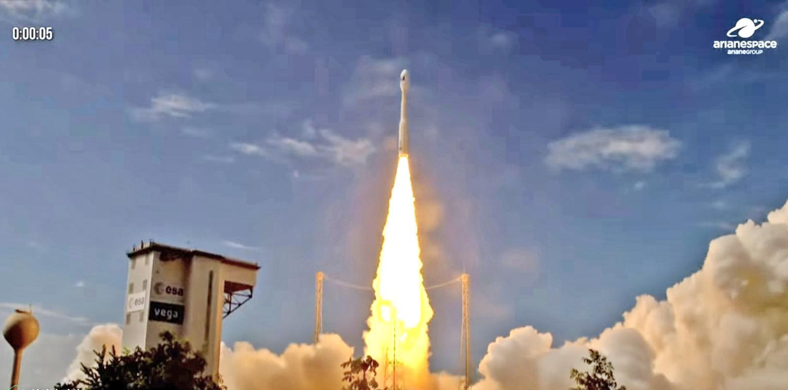 국내 자체 기술로 개발한 초고해상도 관측위성 아리랑 7호가 2일 새벽 2시 21분(한국 시간) 남미 프랑스령 기아나 쿠루 기아나우주센터에서 아리안스페이스 베가-C에 탑재돼 발사되고 있다. (아리안스페이스 유튜브 화면 캡처) 뉴스1