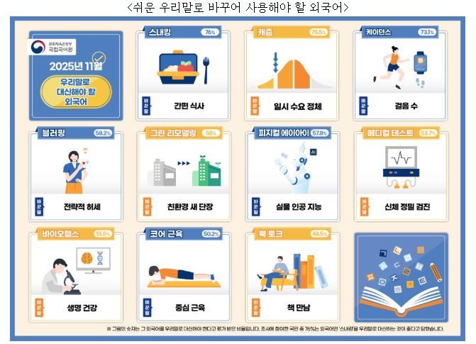이 밖에도 북 토크는 ‘책 만남’, 블러핑은 ‘전략적 허세’, 피지컬 AI(인공 지능)는 ‘실물 인공 지능’, 그린 리모델링은 ‘친환경 새 단장’, 메디컬 테스트는 ‘신체 정밀 검진’으로 정했다.