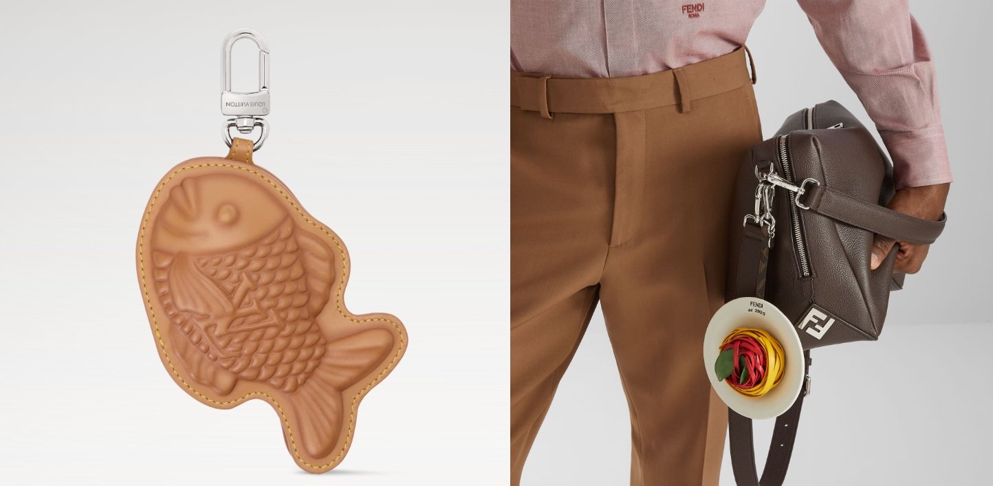 왼쪽은 루이비통 ‘붕어빵 백참’, 오른쪽은 펜디 ‘스파게티 백참’. 명품업계에서 푸드·키치 감성의 음식 모티브 백참·키링이 잇따라 등장하고 있다. 루이비통, 펜디 공식 홈페이지