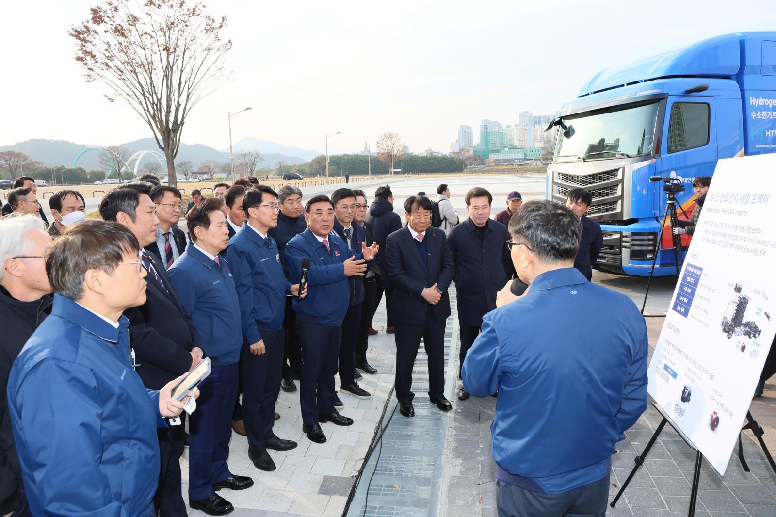 2일 오후 울산 태화강국가정원 남구 둔치에서 열린 ‘전국 최초 탄소배출 없는 수소전기 트랙터 화물운송 실증 차량 인도식’에서 김두겸 울산시장과 현대자동차·울산테크노파크·울산도시공사·CJ대한통운·현대글로비스·롯데글로벌로지스 등 7개 기관·기업 관계자들이 수소전기 트랙터 성능 설명을 듣고 있다. 울산시 제공