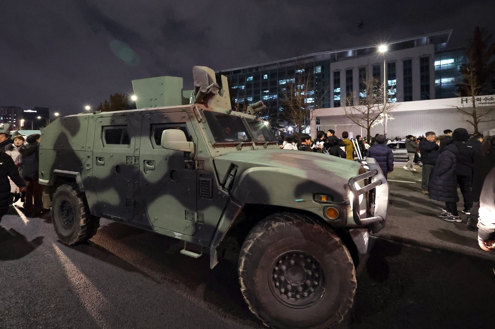 지난해 12월 4일 새벽 서울 여의도 국회 앞 계엄군 차량 뒤로 군 헬기가 경내로 비행하고 있다. 2024.12.4 뉴스1