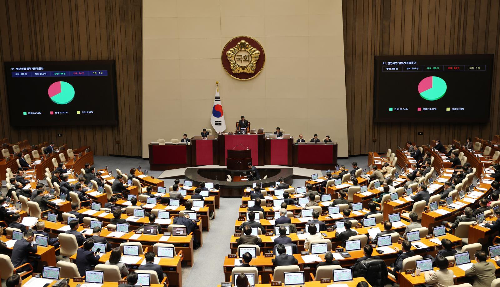 2일 서울 여의도 국회에서 열린 제429회국회(정기회) 제14차 본회의에서 법인세법 일부개정법률안이 찬성 169표, 반대 84표로 통과되고 있다. 뉴스1