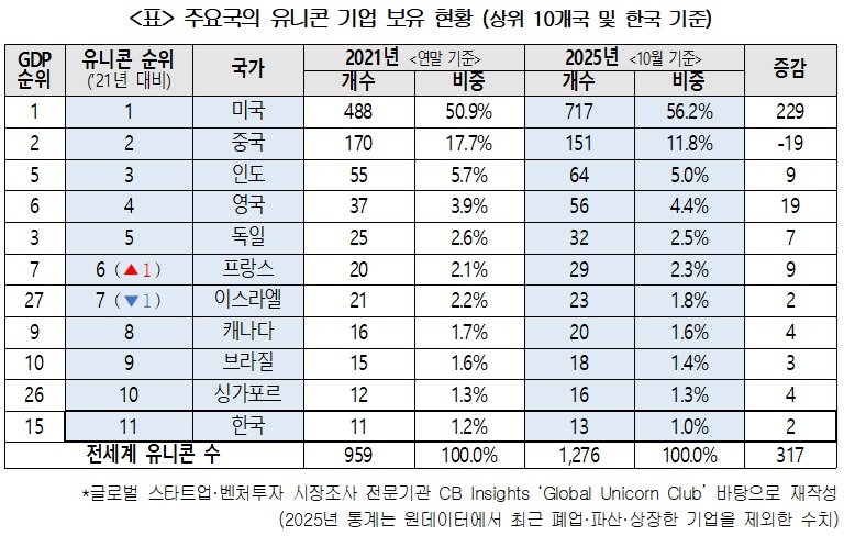 한국 유니콘 기업 13개…세계 11위