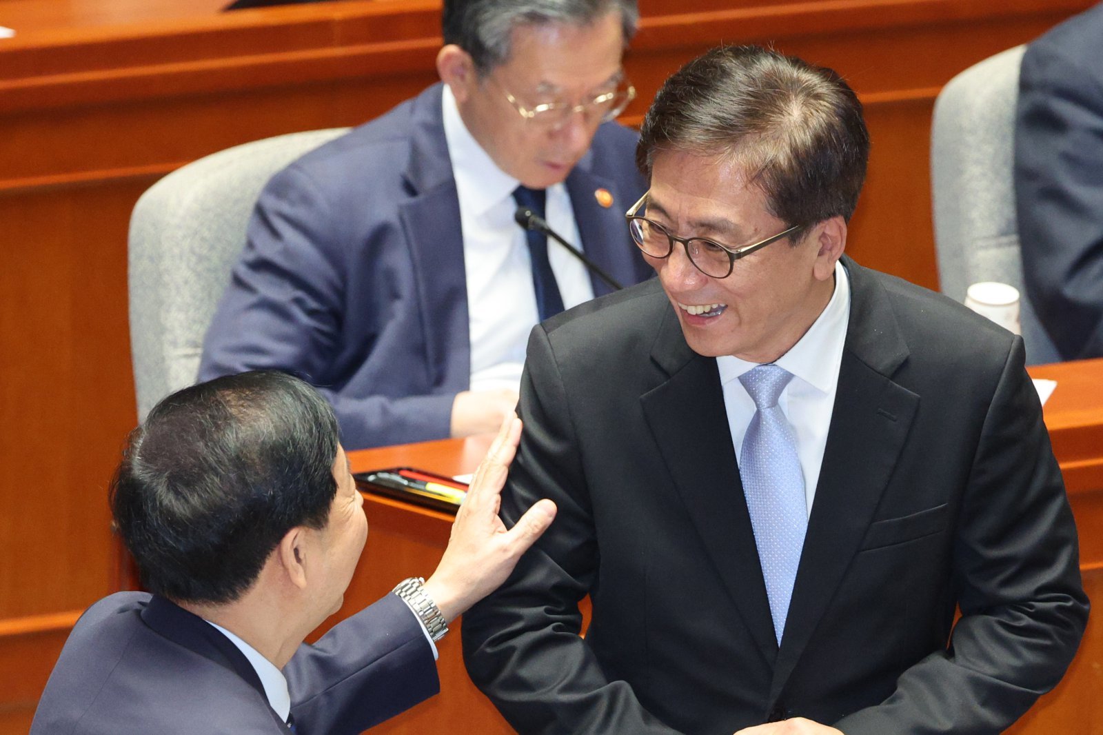 구윤철 경제부총리 겸 기획재정부 장관과 김인회 감사원장 권한대행이 27일 서울 여의도 국회에서 열린 예산결산특별위원회 전체회의에서 인사하고 있다. 2025.11.27/뉴스1