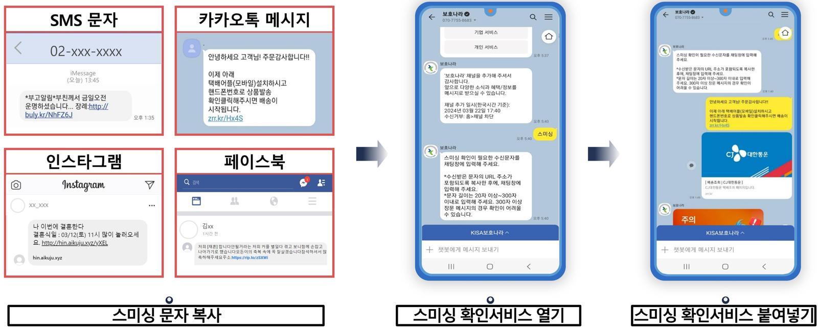 방미통위는 한국인터넷진흥원(KISA)과 함께 통신사 및 삼성전자 등 단말기 제조사에 지능형 스팸 필터링 강화를 요청했다고 밝혔다. 이용자는 카카오톡 ‘보호나라’ 채널에서 문자를 복사, 붙여넣기해 정상 여부를 확인할 수 있다.
