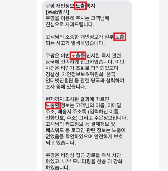 쿠팡이 고객의 개인정보가 유출된 사실을 확인한 뒤에도 개인정보 일부 ‘노출’ 사고 발생이라고 안내했을 뿐 유출 사실을 통지하지 않은 것으로 나타났다.