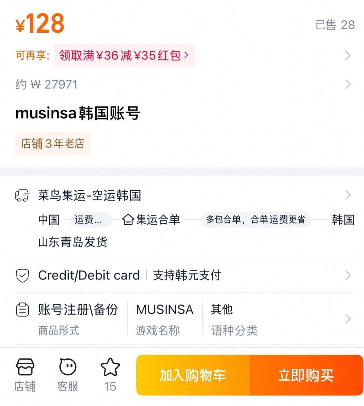3일 타오바오몰에 따르면 한 판매자는 무신사 한국인 계정을 128위안, 약 2만 6650원에 판매한다는 게시글을 올렸다.