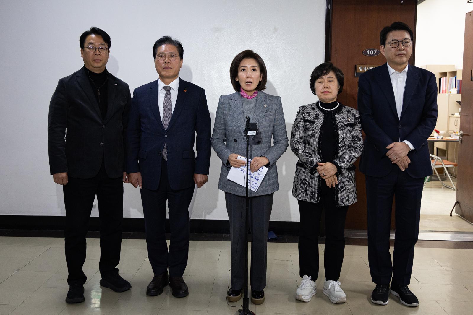 이들은 서울 여의도 국회 법제사법위원회 전체회의장 앞에서 긴급 기자회견을 열고 민주당의 법안 강행에 대해 “독재 완성 단계”라고 비판했다. 나경원 의원은 “더 이상 민주당의 헌법 파괴에 들러리를 설 수 없어 국회 법사위 파행을 선언한다”고 말했다.