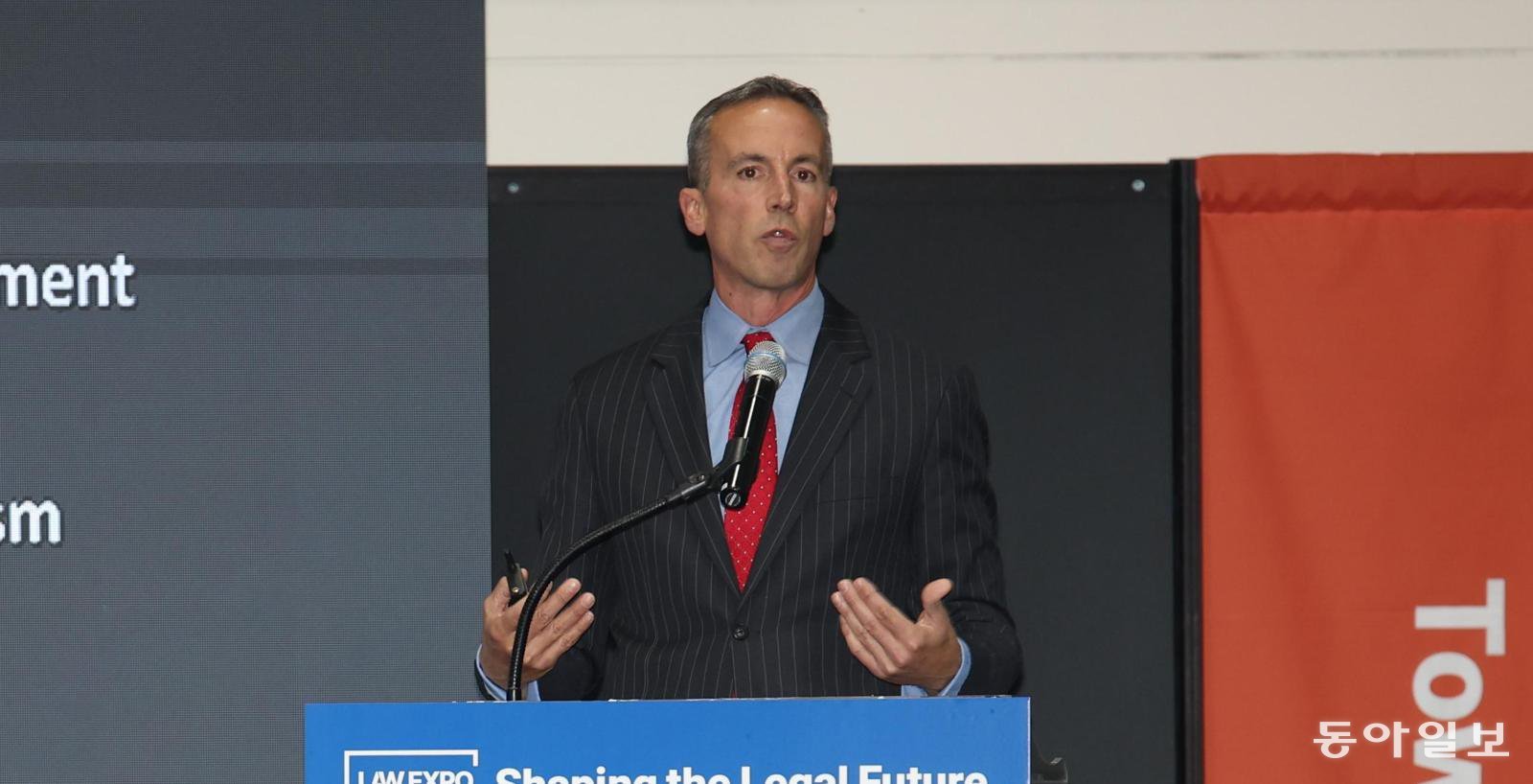 3일 오전 서울 서초구 양재동 aT센터에서 열린 ‘2025 대한민국 법률 산업 박람회’에서 로펌 스캐든 아프스의 랜스 에체베리 파트너 변호사가 기조연설을 하고 있다.