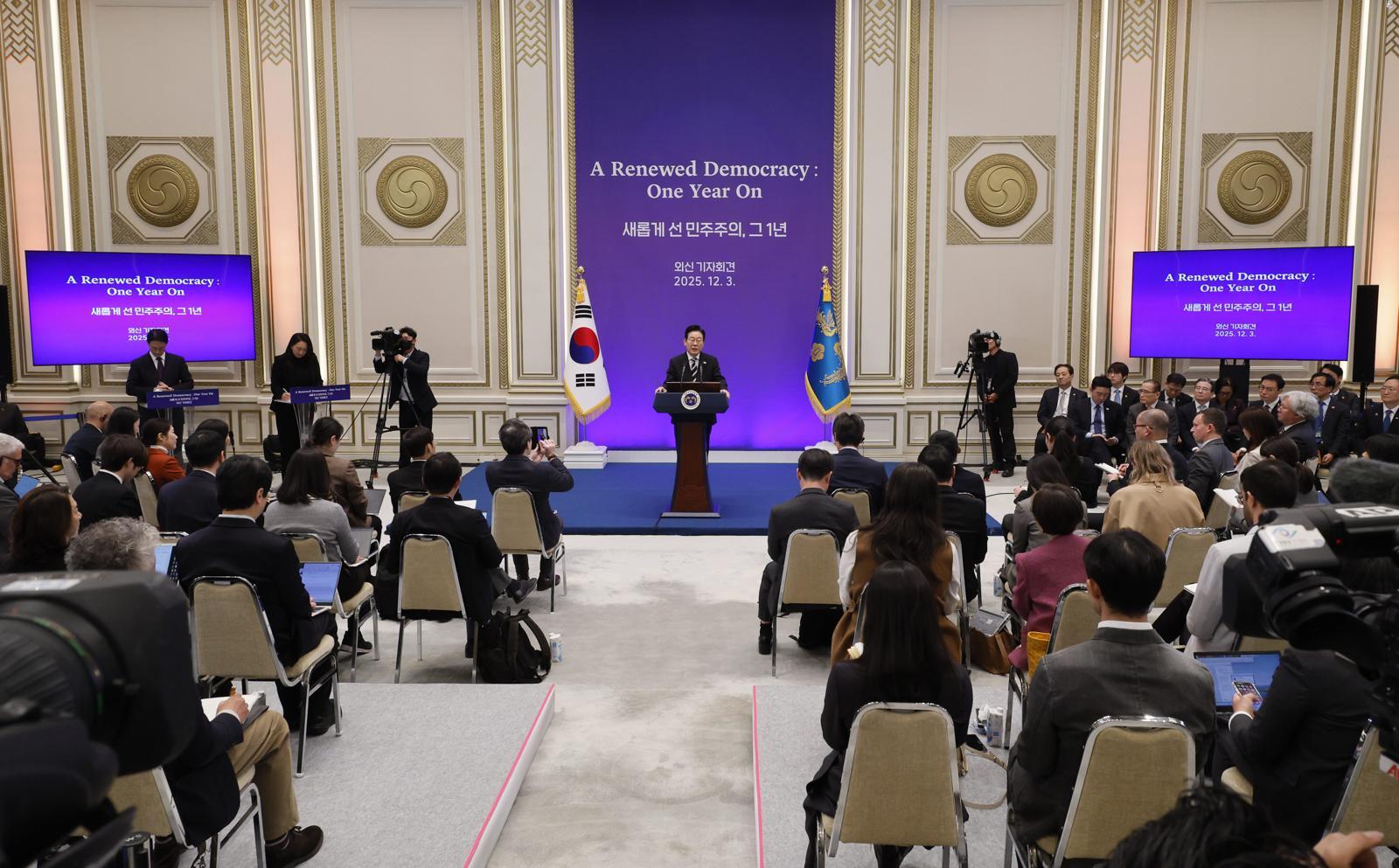 이재명 대통령이 비상계엄 1년을 맞은 3일 서울 청와대 영빈관에서 외신 기자회견을 하기 위해 입장하고 있다. 2025.12.3 대통령실사진기자단