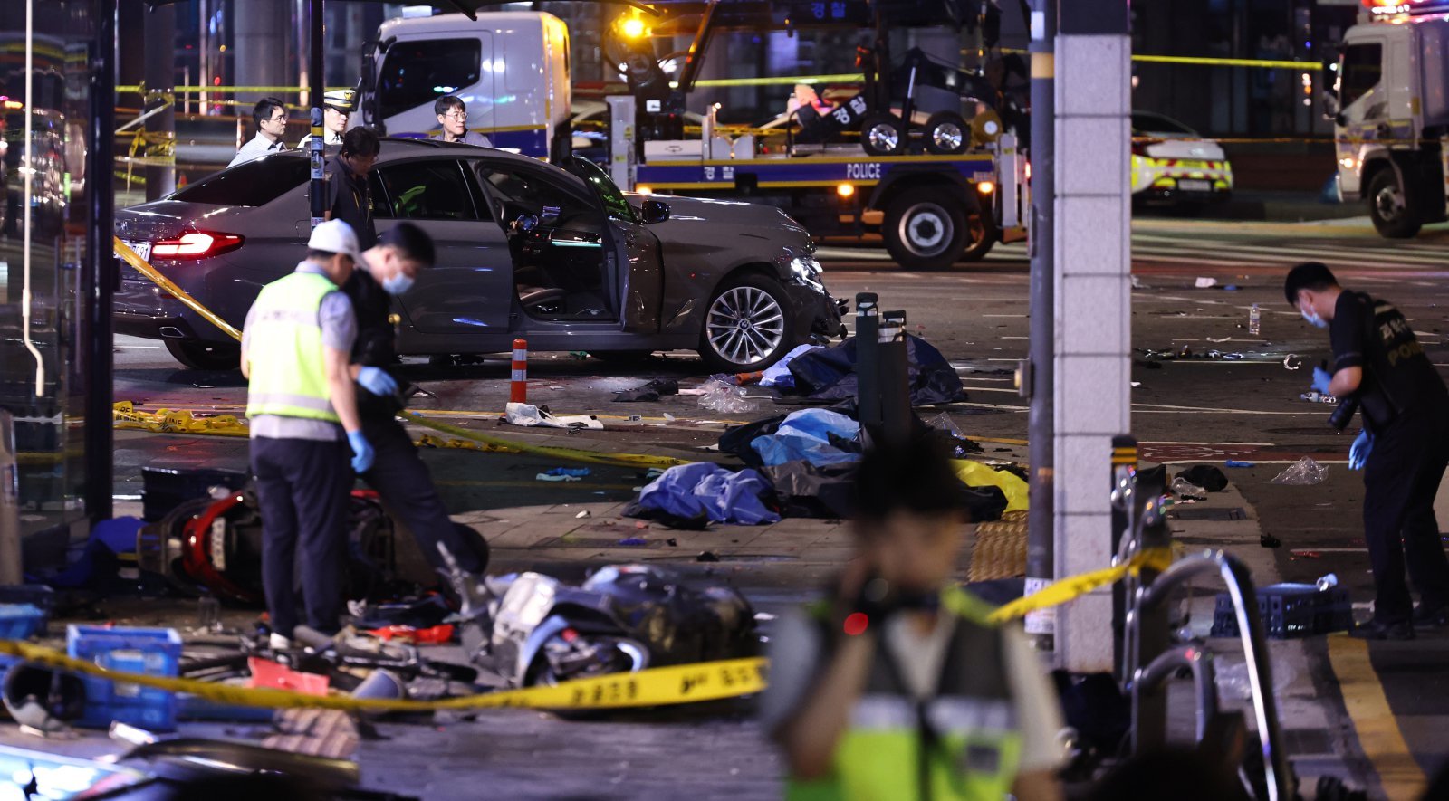 2일 오전 서울 중구 서울시청 인근 교차로 대형 교통사고 현장에서 과학수사대가 현장조사를 하고 있다. 지난 1일 오후 9시 27분쯤 서울시청 인근 교차로에서 차량이 인도로 돌진해 9명이 숨지는 대형 교통사고가 발생했다. 경찰과 소방당국에 따르면 이 오후 9시27분께 서울 지하철 2호선 시청역 인근 교차로에서 제네시스 차량이 역주행해 BMW, 소나타 등 차량을 차례로 친 후 횡단보도에 있던 보행자들을 덮치는 사고가 발생했다. 2024.07.02. [서울=뉴시스]