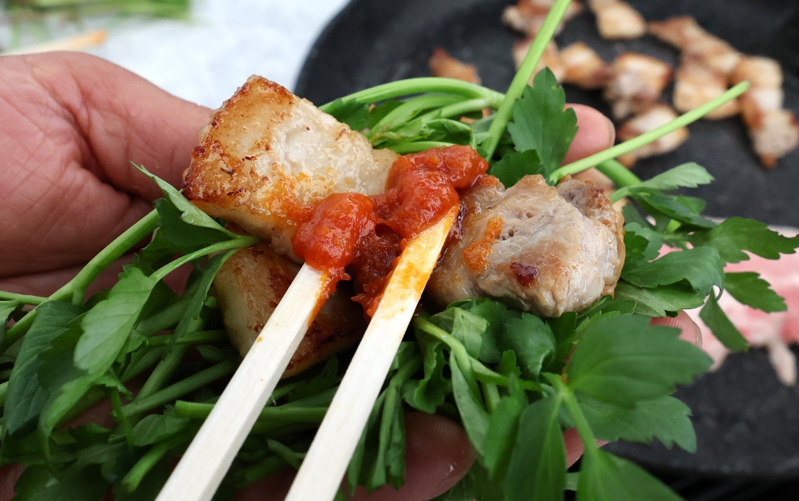 14일 대구 달서구 옛 두류정수장에서 열린 미나리·삼겹살 소비촉진 행사에서 시민들이 구매한 미나리와 삼겹살을 즉석에서 구워 맛보고 있다. 2025.03.14. [대구=뉴시스]