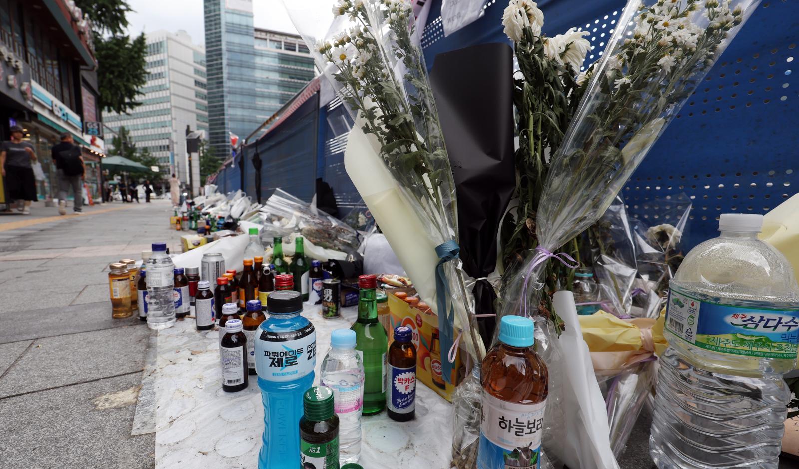15일 서울 중구 ‘시청역 교차로 역주행’ 사고현장에 국화꽃 등 추모 물품들이 놓여져 있다. 2024.7.15 뉴스1