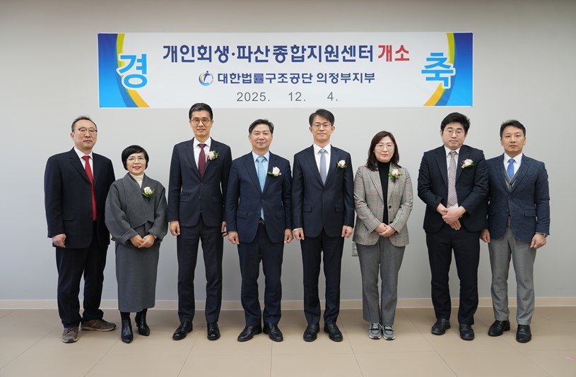 대한법률구조공단 김영진 이사장(왼쪽에서 4번째)이 의정부 개인회생·파산종합지원센터 개소식 행사 후 기념촬영을 하고 있다. (대한법률구조공단제공)대한법률구조공단(이사장 김영진)이 4일 의정부파산센터를 개소한다고 밝혔다. 의정부파산센터는 2009년 서울센터 개소를 시작으로 대구, 부산, 광주, 대전, 수원, 울산, 인천에 이어 전국에서 아홉 번째로 문을 열었다.