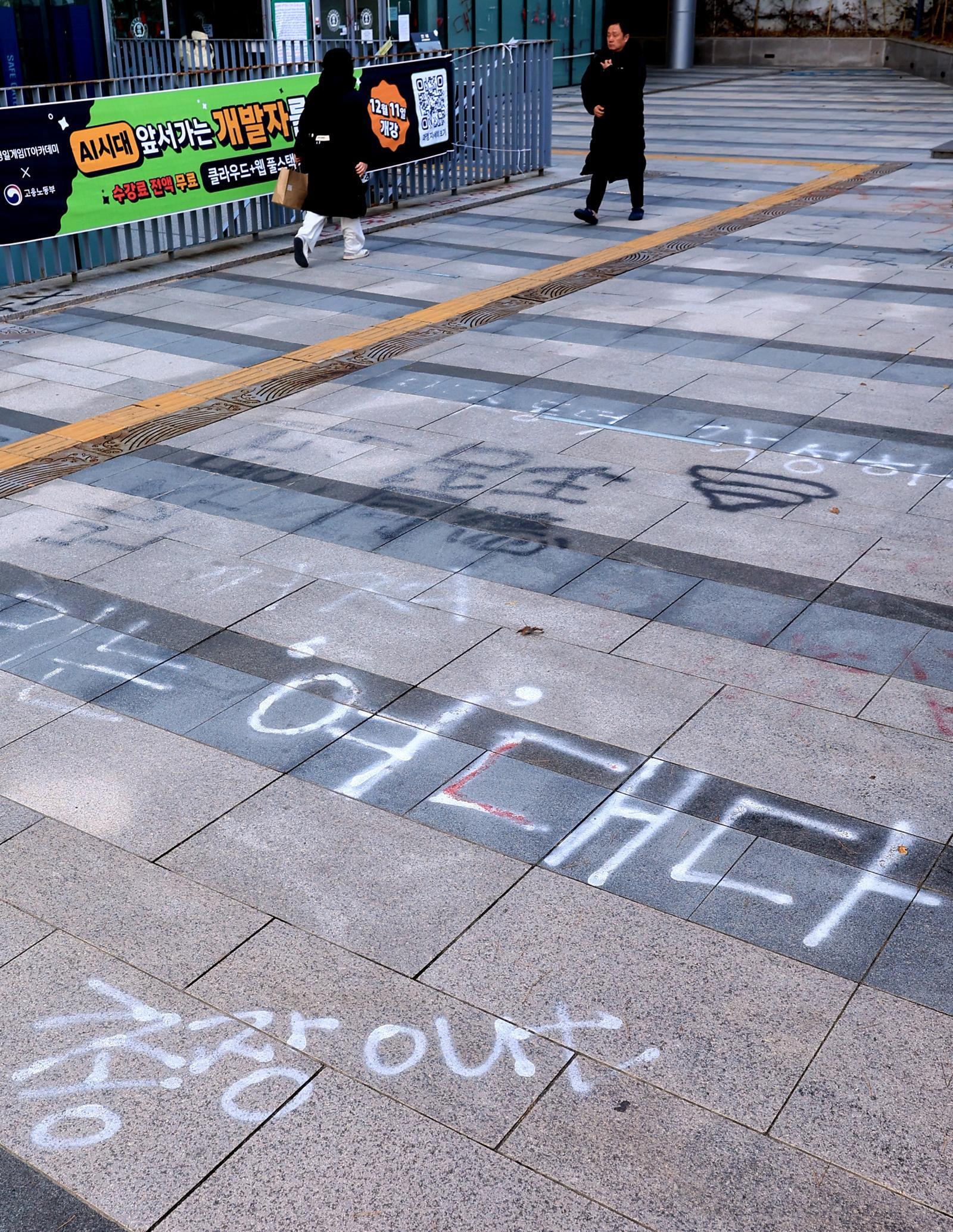 동덕여자대학교와 학생들은 4일 캠퍼스 건물 공학 반대 항의 래커 제거 행사와 공학전환 강행 반대 시위를 각각 계획예정이었으나 동덕여대를 겨냥한 흉기난동 예고 글이 인터넷에 올라오면서 두 일정을 잠정 연기했다. 사진은 이날 서울 성북구 동덕여자대학교에 공학 전환 반대 관련 래커칠이 남아있는 모습. 2025.12.4/뉴스1