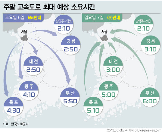 지역별 예상 소요시간은 토요일 서울에서 ▲대전까지 2시간50분 ▲부산까지 5시간50분 ▲강릉까지 2시간50분이다. 일요일 서울 방향으로는 ▲대전에서 3시간 ▲부산에서 6시간 ▲강릉에서 3시간10분이다.