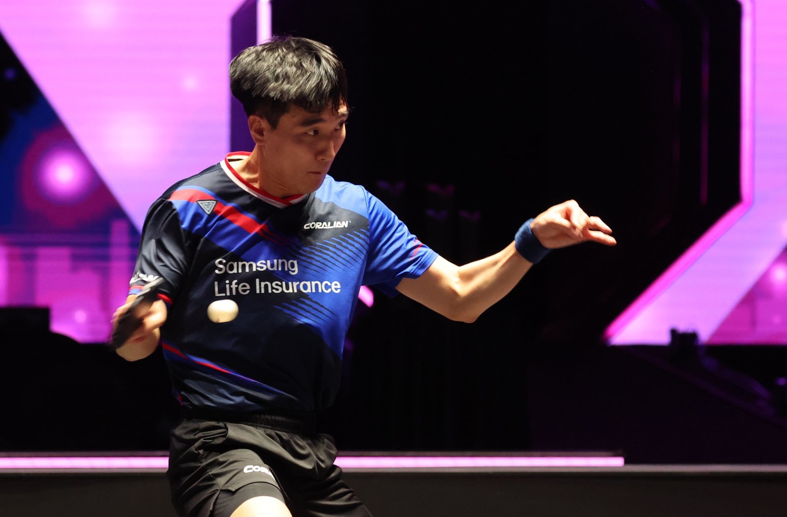 6일 인천 중구 인스파이어 아레나에서 열린 WTT(월드테이블테니스) 챔피언스 인천 2025 대회에서 이상수(대한민국)가 샹펭(중국)을 상대로 남자 단식 결승 경기를 펼치고 있다. 2025.04.06 뉴시스