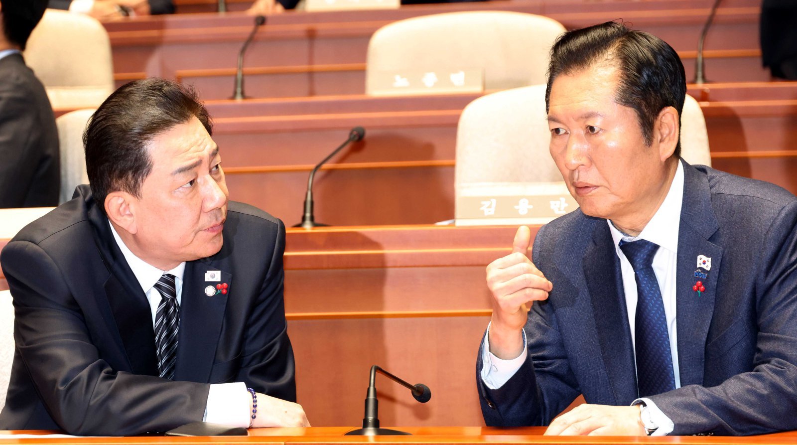[서울=뉴시스] 정청래 더불어민주당 대표와 김병기 원내대표가 11일 오후 서울 여의도 국회에서 열린 의원총회에서 대화를 하고 있다.2025.12.11.
