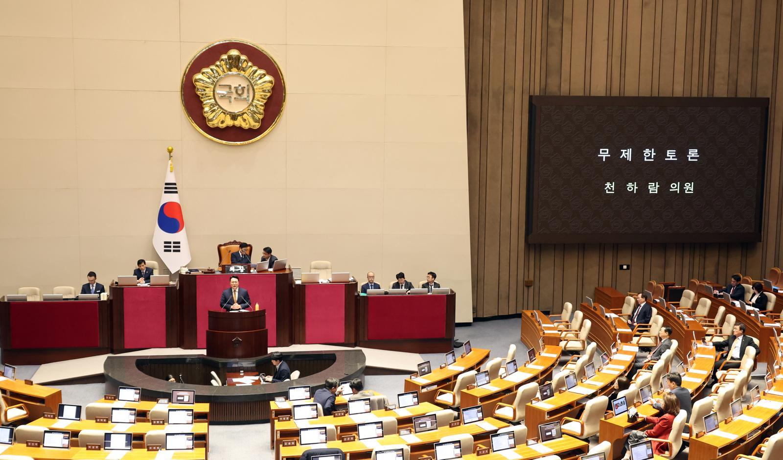 특검법 반대에 공조하기로 한 국민의힘과 개혁신당은 연대 필리버스터(무제한 토론)에 돌입했다. 첫 주자로 나선 개혁신당 천하람 원내대표는 “우리에게 필요한 것은 죽은 권력을 부관참시하는 재탕, 삼탕의 2차 종합 특검이 아니라 현재 살아있는 권력의 부패를 도려내는 통일교 특검과 돈 공천 특검”이라고 말했다.