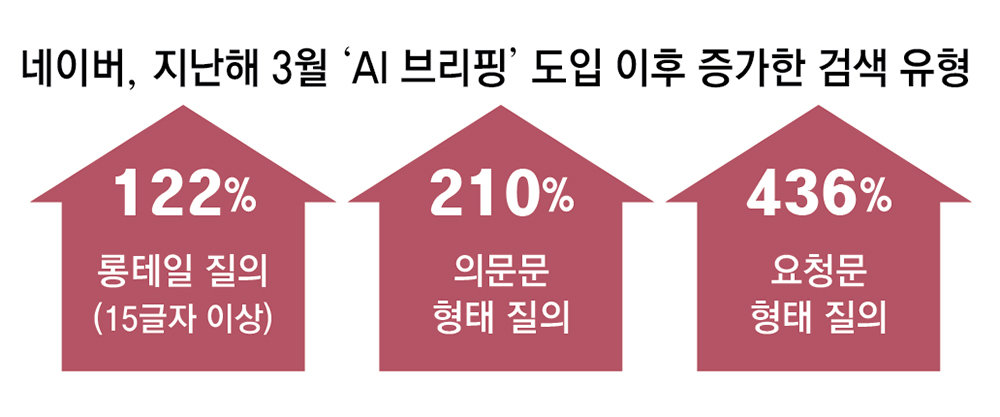 교차 사용자의 증가는 기존 검색의 형태도 바꾸고 있다. 단순히 단어 몇 개만 검색하던 과거와 달리 구체적인 상황과 목적을 포함한 ‘문장형·시나리오형 질의’가 빠르게 늘고 있다. 네이버의 경우 지난해 3월 검색 결과에 대한 ‘AI 브리핑’ 기능을 출시한 이후 15글자 이상의 ‘롱테일 질의’ 비중이 2배 이상(122%)으로 증가했고, 의문문 형태의 질의는 3배(210%), 요청문 형태의 질의는 5배 넘게(436%) 증가한 것으로 나타났다. 업계 관계자는 “검색의 역할이 단순 정보 탐색을 넘어 실질적인 ‘과업 해결’로 확장되고 있다”고 말했다.