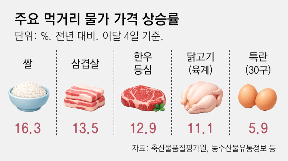 돼지고기, 한우, 쌀 등 주요 먹거리 가격이 1년 새 10% 넘게 올랐다. 아프리카돼지열병(ASF)과 겨울철 조류인플루엔자(AI) 유행으로 축산물 가격이 오른 데다 고환율 여파로 수입 과일 가격까지 들썩이며 서민 ‘밥상 물가’에 비상등이 켜졌다. 국제유가 급등에 따른 비료, 면세유, 운송비 등 상승으로 먹거리 물가 전반이 불안해질 가능성이 커졌다.