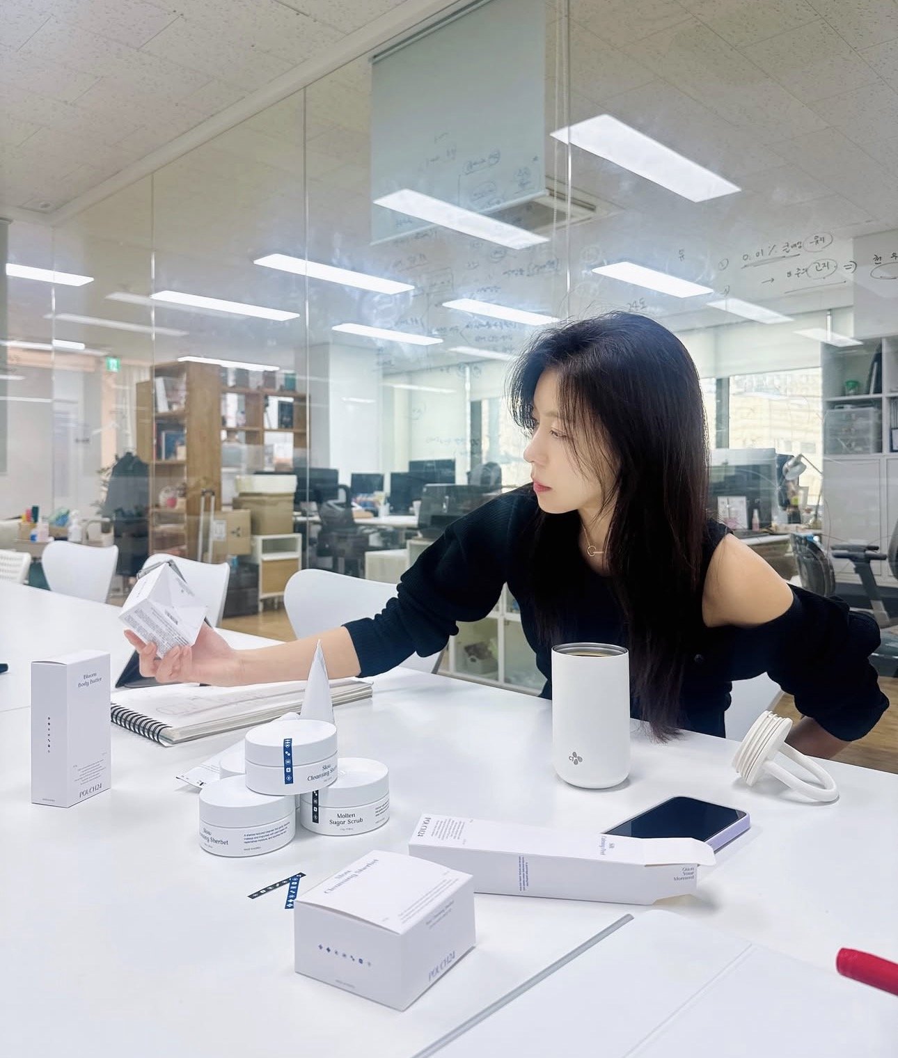 그는 5일 소셜미디어에 “오늘은 회사에서 파우치24 신제품 회의 중이에요”란 글과 함께 사진 두 장을 올렸다.