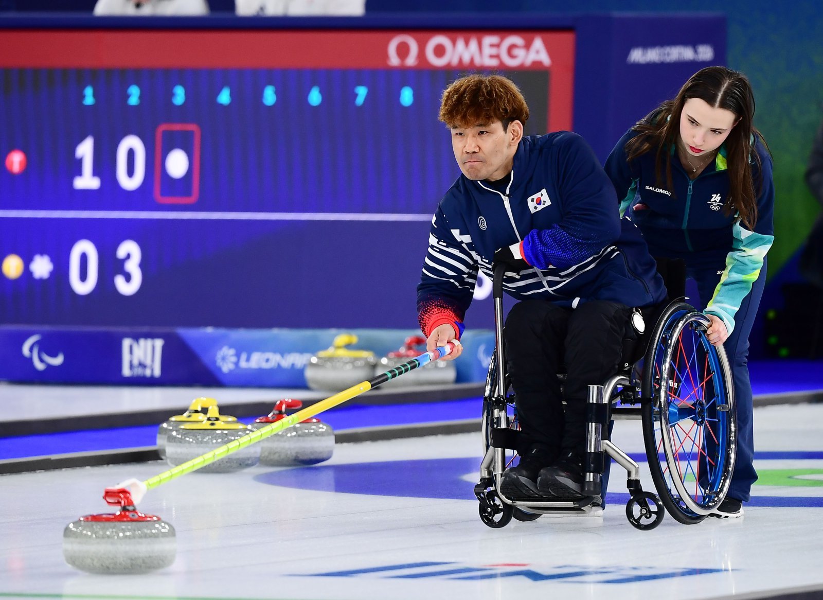 백혜진-이용석은 6일(한국 시간) 이탈리아 코르티나담페초의 코르티나 컬링 올림픽 스타디움에서 열린 대회 휠체어컬링 믹스더블 예선 3차전에서 일본의 나카지마 요지-오가와 아키를 9-0으로 완파했다.