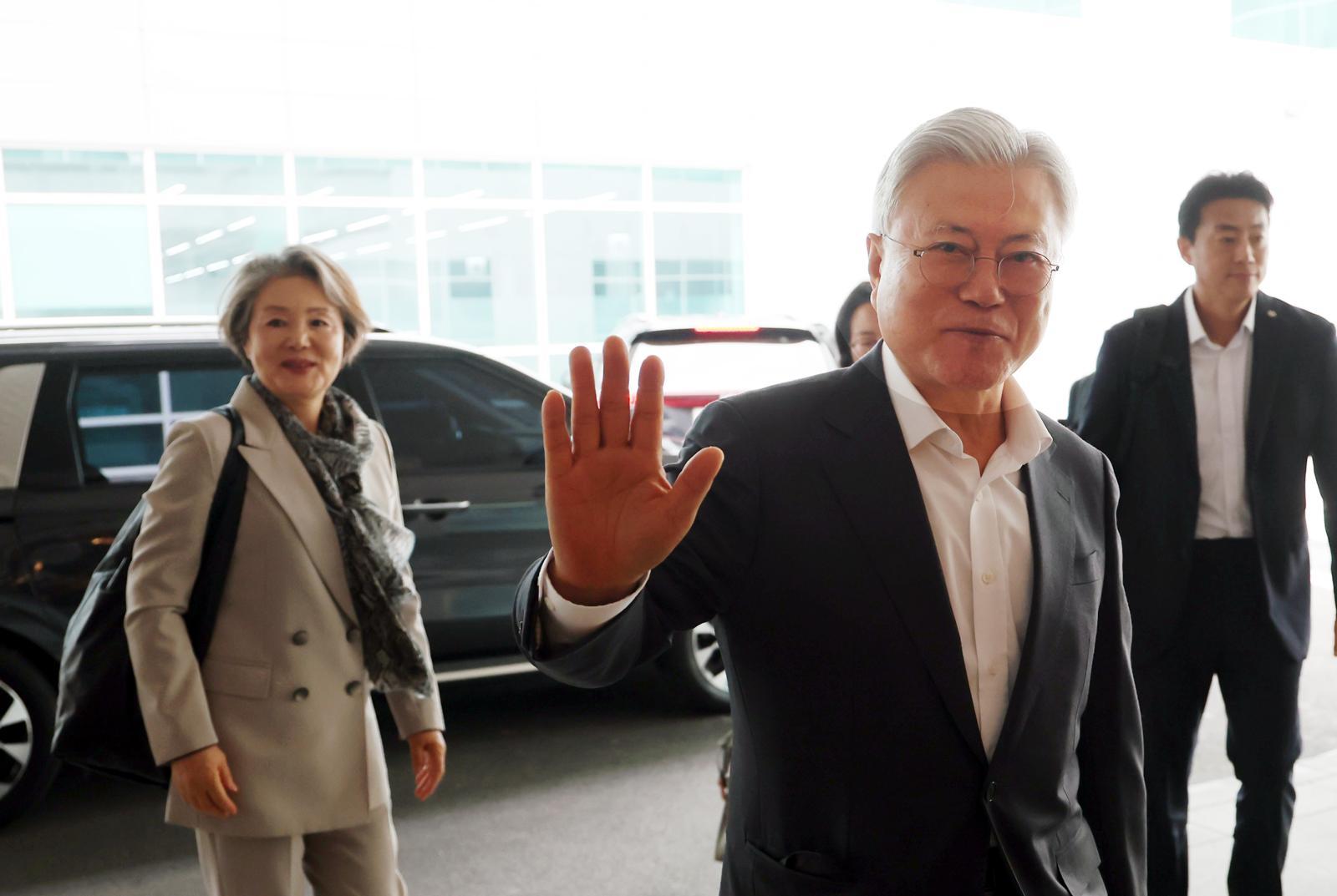 미국으로 출국하는 문재인 전 대통령과 김정숙 여사가 5일 부산 강서구 김해국제공항에 도착, 차량에서 내려 인천공항으로 향하기 위해 이동하고 있다. 뉴시스