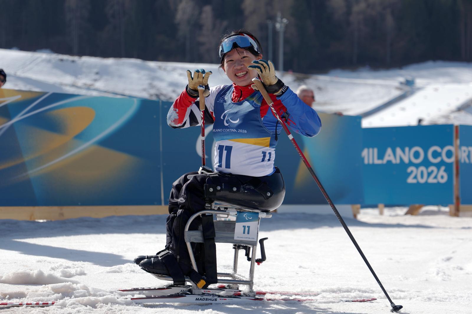 김윤지가 8일 이탈리아 테세로 크로스컨트리 스타디움에서 열린 2026 밀라노-코르티나담페초 겨울패럴림픽(장애인올림픽) 바이애슬론 여자 개인 좌식 12.5km 결선에서 금메달을 차지한 뒤 카메라를 향해 양손을 흔들고 있다. 대한장애인체육회 제공