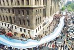 아르헨티나의 사법권독립을 요구하는 시위대들이 29일 부에노스아이레스 중앙재판소를 인간사슬로 빙 둘러싼 채 대형국기를 들고 있다.