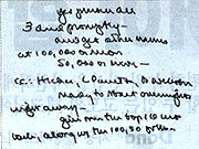 클린턴대통령이 2년전 고액 헌금자에게 백악관에서 하룻밤 묵고가는 특혜를 주는 방안을 즉각 실시하라고 지시한 친필 노트. 당시 해롤드 이크스 백악관비서실 부실장에게 보낸 이 노트에서 클린턴은 『좋아. 세가지 방안을 모두, 그리고 신속히 추진하시오. 그리고 10만달러 이상, 5만달러 이상을 기부한 사람 명단도 보여주시오. 백악관 숙박은 즉시 시행토록 준비하고 최고액 헌금자 10명의 명단도 갖다주시오』라고 말하고 있다.〈뉴욕타임스 제공〉