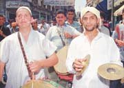 맞아 시돈시에서 뺨에 쇠꼬챙이를 꽂은 채 행진하고 있다.