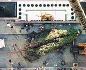 뉴욕 록펠러 플라자 앞에 선보일 높이 22m의 대형 크리스마스 트리를 13일 인부들이 설치하고 있다. 12월2일부터 점등될 이 상록수 트리는 약 8km 길이의 전선에 2만6천개의 전구로 장식된다. 〈뉴욕AP연합〉