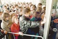 수천명의 러시아 실업자들이 23일 모스크바에서 열린 한 취업박람회에 먼저 들어가기 위해 몸싸움을 벌이고 있다. 모스크바에서는 3개월마다 취업박람회가 열린다.
