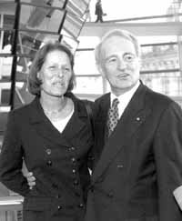 요하네스 라우 독일 대통령당선자가 23일 연방회의 대의원들이 자신을 대통령으로 선출한 뒤 부인 크리스티나와 함께 베를린 제국의회 옥상에 올라가 밝은 표정으로 기념촬영을 하고 있다. <베를린AP연합>