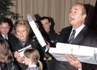자크 시라크 프랑스대통령(오른쪽)이 15일 파리 엘리제 대통령궁에서 열린 성탄절 축하파티 도중 부인 베르나데트 여사가 지켜보는 가운데 어린이들에게 선물을 나눠주고 있다.