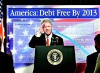 빌 클린턴 미국 대통령이 7일 미 워싱턴 백악관에서 그의 집권을 마감하는 2001 회계연도 예산안을 발표한 뒤 기립박수를 보내는 보좌진과 지지자들에게 거수경례를 하고 있다.