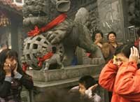 대만 집권 국민당의 총통 후보인 롄잔의 지지자들이 12일 대만 가오슝에서 열린 국민당 유세 도중 폭죽이 터지자 귀를 틀어막고 있다. 대만은 18일 리덩후이 총통의 후임자를 뽑는 선거를 한다.