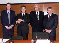 세계 최대 자동차업체인 미국 제너럴 모터스(GM)사의 리처드 와거너 주니어 회장(왼쪽)과 이탈리아 최대 자동차업체인 피아트사의 파올로 프레스코 회장(왼쪽에서 세번째) 등이 13일 이탈리아 튜린에서 주식상호보유를 통한 전략적 제휴를 발표한 뒤 사진촬영하고 있다.