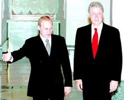 블라디미르 푸틴 러시아 대통령(왼쪽)이 3일 모스크바 크렘린궁에서 빌 클린턴 미국 대통령을 만찬장으로 안내하고 있다.