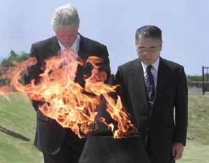 선진8개국(G8)정상회의에 참석중인 빌 클린턴 미국 대통령(왼쪽)이 21일 오키나와에 있는평화의 비를 방문해 묵념하고 있다. 오런쪽은 아나미네 게이치 오키나와 지사.