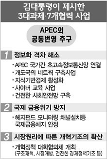 김대통령은 이번 회의에서 △정보화 격차 해소 △국제금융체제 강화 △개혁기조의 확산 등 3대 과제에 7개 협력사업을 제안해 모두 정상선언문에 반영시켰다. 특히 헤지펀드 모니터링의 필요성을 역설해 회원국들로부터 좋은 반응을 얻었다.