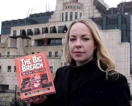 영국 IDC출판사의 안도티아 크로포드가 지난달 30일 런던 중심가에 위치한 대외 정보기관 MI6를 배경으로 이날 발간된 MI6 전직 요원 리처드 톰린슨이 쓴 회고록 ‘대 위반’을 들고 서 있다. 영국 당국은 이 책의 출판을 막으려 했으나 결국 실패했다. 「런던 AFP 연합」